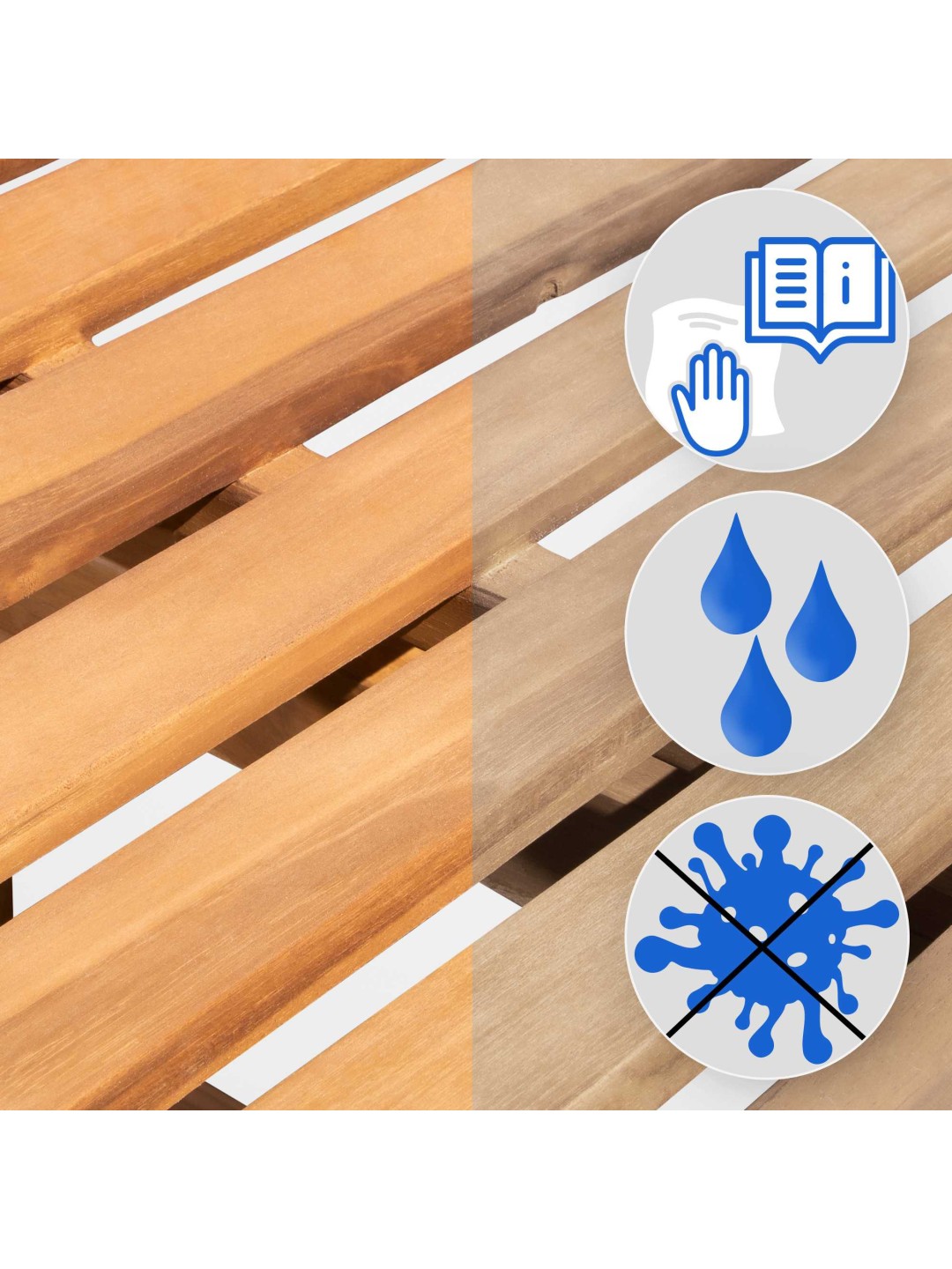 Le bois précieux de teck est un matériau de très haute qualité et durable. Votre salon de jardin en teck peut donc rester dehors toute l'année. Pour conserver durablement la couleur, nous vous recommandons d'utiliser des huiles d'entretien adaptées au bois de teck, que vous pouvez vous procurer si nécessaire auprès du commerce spécialisé. Ce banc en teck est disponible en différentes longueurs. Que ce soit individuellement ou en combinaison, il y a toujours suffisamment d'espace pour des moments de détente dans votre jardin !