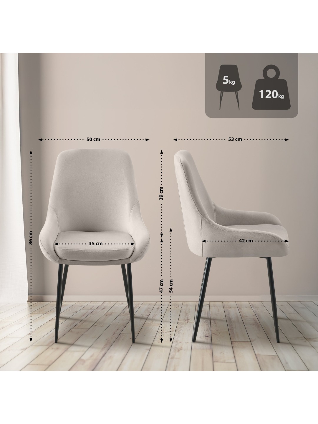 Vivez une expérience d'assise élégante et confortable avec la chaise de salle à manger Elmira. La chaise de salle à manger moderne est le complément parfait à toute salle à manger, grâce à son design élégant en velours de haute qualité. La finition solide et la construction robuste caractérisent la chaise Elmira, qui peut supporter jusqu'à 150 kg. Avec une hauteur d'assise fixe de 47 cm et une assise rembourrée, il offre un confort optimal pendant de longues périodes.